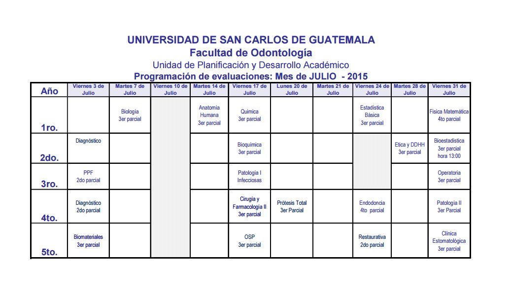 Calendariodeexamenesjulio por Fac. Odontologia USAC|Publicada 2 julio, 2015-en dimensiones 1037 × 618 Navegación de imágenes Anterior Siguiente